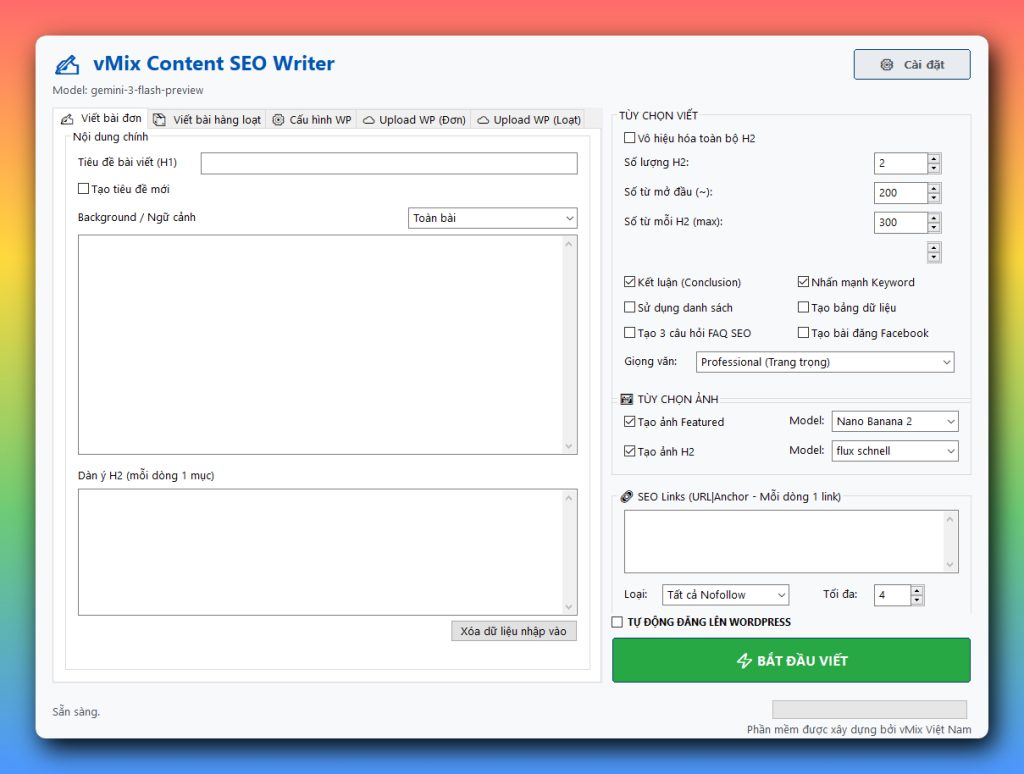 Việc duy trì tần suất xuất bản nội dung chất lượng cao trên hệ thống website vệ tinh thường tiêu tốn hàng chục giờ làm việc mỗi tuần của đội ngũ biên tập. Phần mềm vMix Content SEO Writer v9.0 ra đời như một trợ lý đắc lực giúp giải quyết bài toán hiệu suất cho các Content Creator, Marketer và những người làm SEO hệ thống. Bằng cách tích hợp chuẩn API mới nhất từ Google Gemini (2.5 Flash / 3 Pro), công cụ này không chỉ đảm bảo tốc độ sinh văn bản cực nhanh mà còn tối ưu chi phí vận hành ở mức thấp nhất cho người sử dụng.